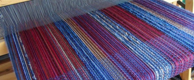 I made snippets of all the different threads I wanted to include, and played around with them until I had a pattern of colors I liked. Here are all the beautiful warp-threads on the loom with the beginnings of a “Rose-path” weft pattern in medium blue that let the warp colors shine through: